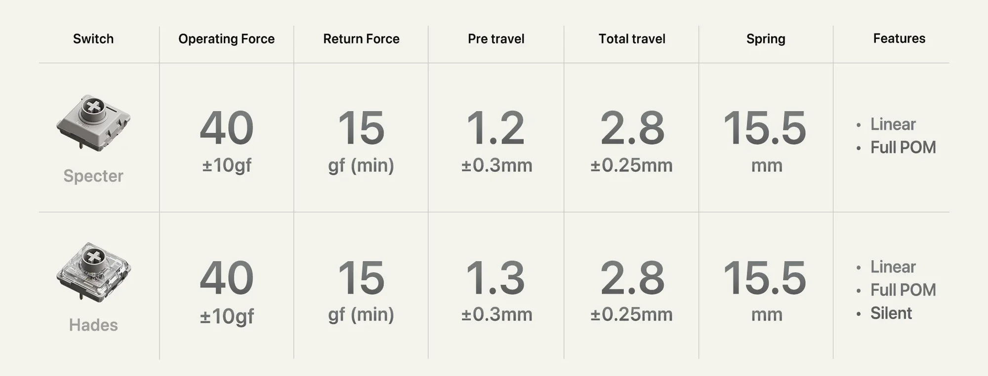 If you are a fan of silent switches, don't forget to check out our Hades switches. Each keystroke is cushioned by two silicone dampeners, magically silencing the sound and allowing you to type with divine ease and serene artistry.
